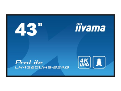The iiyama ProLite LH4360UHS-B2AG offers a 43-inch 4K UHD LED-backlit LCD flat panel display designed for commercial use. With a resolution of 3840 x 2160 and a brightness of 500 cd/m2, this display ensures stunning visuals that captivate any audience. It features a wide viewing angle of 178°, making it suitable for digital signage in both portrait and landscape modes. This display is built for reliability with a 24/7 operation capacity and an MTBF of 50,000 hours, ensuring minimal downtime for commercial environments. Equipped with built-in speakers delivering a total output power of 20 watts, it also incorporates advanced features like anti-image retention and Signal Failover to enhance performance. The iiyama ProLite LH4360UHS-B2AG is designed with a fanless architecture and a thin bezel, offering a sleek appearance that fits seamlessly into any setting.