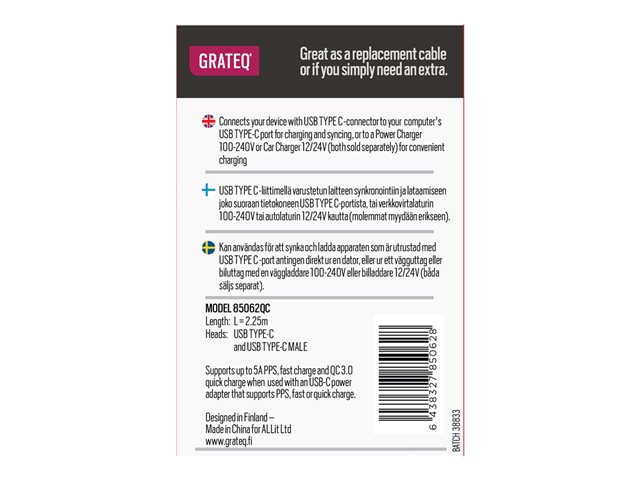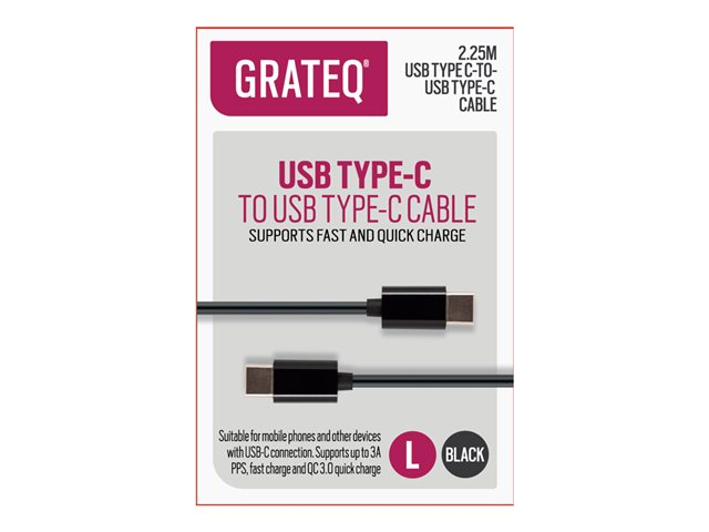 GRATEQ - USB-kabel - 24 pin USB-C (hane) till 24 pin USB-C (hane) - 5 A - 2.25 m - USB-strömförsörjning (100W) - svart