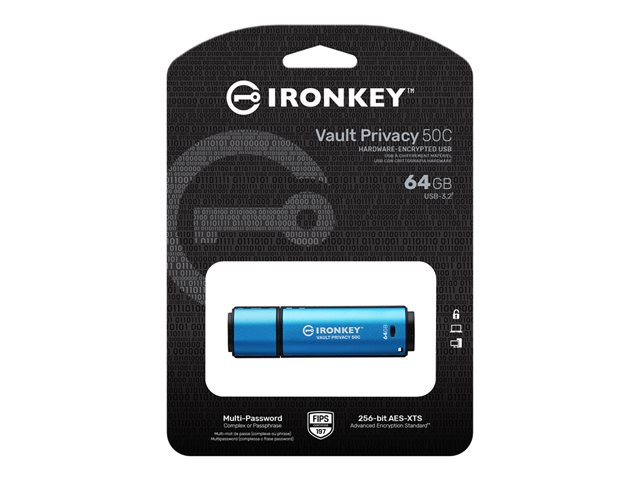 Kingston IronKey Vault Privacy 50 series are premium USB drives Type-A and Type-C that provide business-grade security with FIPS 197-certified AES 256-bit hardware-encryption in XTS mode, including safeguards against BadUSB with digitally-signed firmware and against Brute Force password attacks. Because it is encrypted storage under the user's physical control, VP50 series are superior to using the Internet and cloud services to safeguard data.
