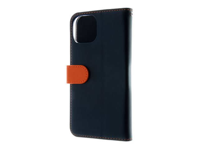 Insmat Exclusive - Vikbart fodral för mobiltelefon - genuint läder, polykarbonat, kartong+papper+aluminiumfolie - svart, orange - för Apple iPhone 15 650-3192