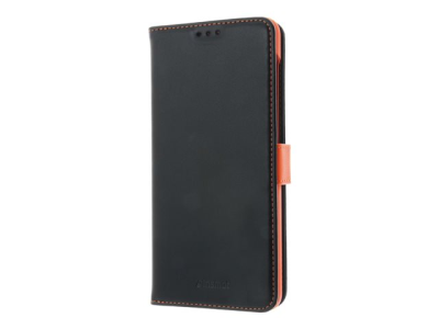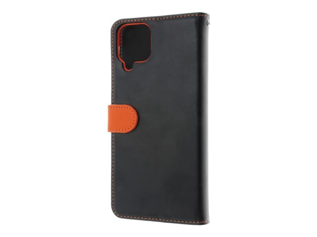Insmat - Vikbart fodral för mobiltelefon - genuint läder, termoplastisk polyuretan (TPU), polyuretanklädsel - svart, orange, galvaniserad bronsring - för Samsung Galaxy A12