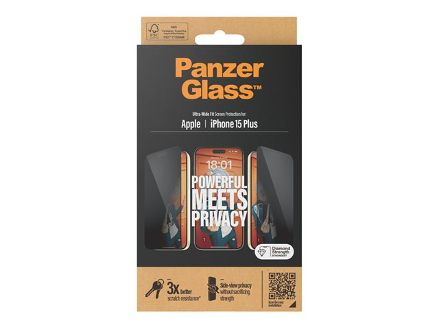 PanzerGlass - Skärmskydd för mobiltelefon - ultrabred passning - glas - med sekretessfilter - ramfärg svart - för Apple iPhone 15 Plus
