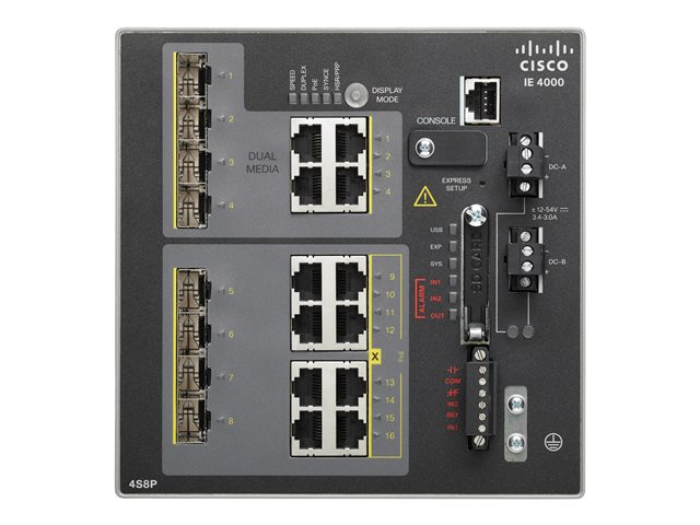 | Gränssnitt | 4 x 1000Base-T RJ-45 PoE+ 4 x 1000Base-T RJ-45 upplänk 4 x SFP upplänk 1 x mini-USB Type B 1 x konsol RJ-45 4 x 1000Base-X SFP 4 x 1000Base-T RJ-45 |