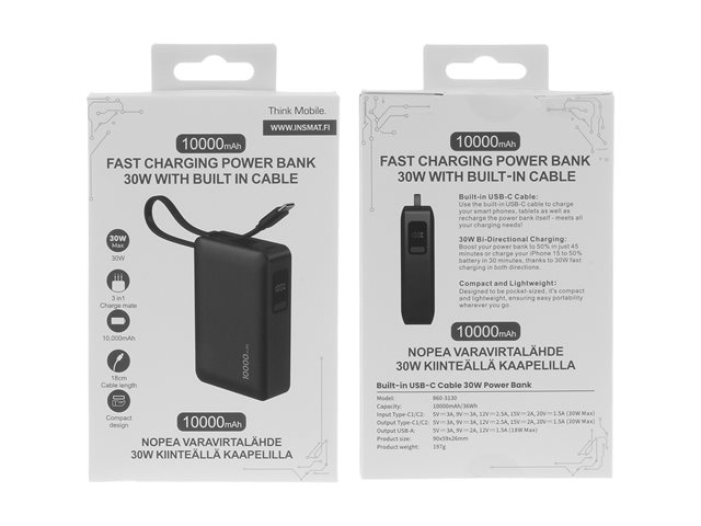 Insmat - Power bank - 10000 mAh - 30 Watt - PD, Fast Charge - 3 utdatakontakter (2 x USB-C, USB)